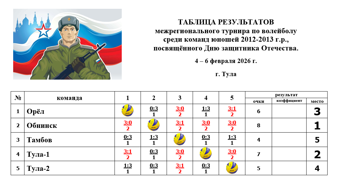 На базе Тульской спортивной школы «Игровые виды спорта» с 4 по 6 февраля прошёл межрегиональный турнир по волейболу среди юношей 2012–2013 годов рождения. В соревнованиях приняли участие пять сильнейших команд из четырёх регионов: Тулы, Обнинска, Орла и Тамбова. За призовые места боролись не только спортсмены, но и целые системы подготовки, и, как показал турнир, тульские команды стали главной гордостью домашнего болельщика.