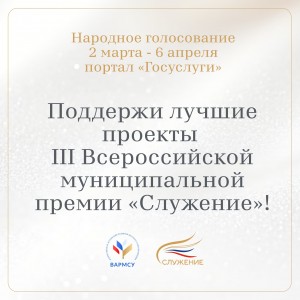 Всероссийская муниципальная премия «Служение» проводится по поручению Президента Владимира Путина. Организатор — Всероссийская ассоциация развития местного самоуправления *clck.ru/eFstW (ВАРМСУ) при поддержке Администрации Президента РФ